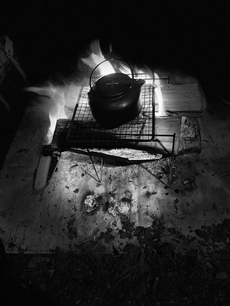 焚き火に当たりながら湯を沸かし、ケトルの中で跳ねる水の音を聞く。火の温度と、沸騰のタイミングを肌で覚え