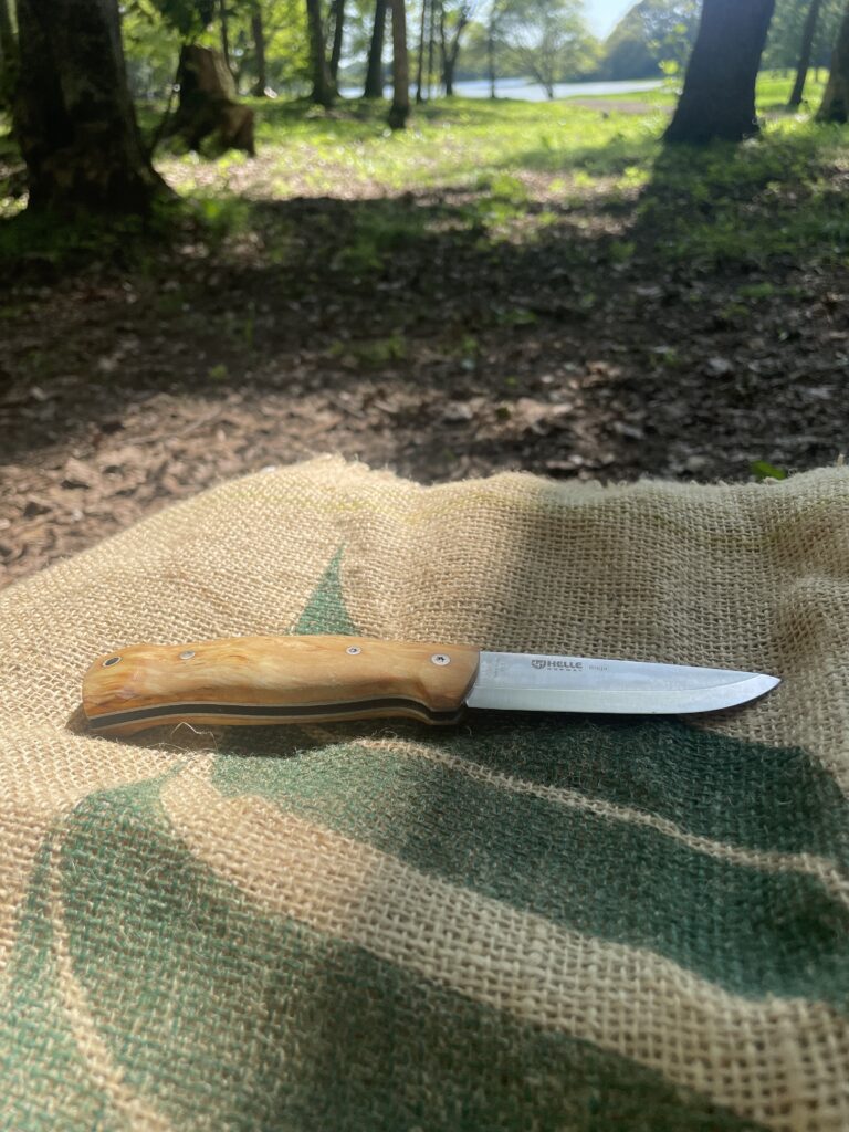 私が愛用しているのは、HELLE ディディガルガルというナイフ。これもヒロシさん愛用の一本ですが、見た目は無骨なのに、刃の仕上げが丁寧で、手にした瞬間から信頼できる道具だとわかる。